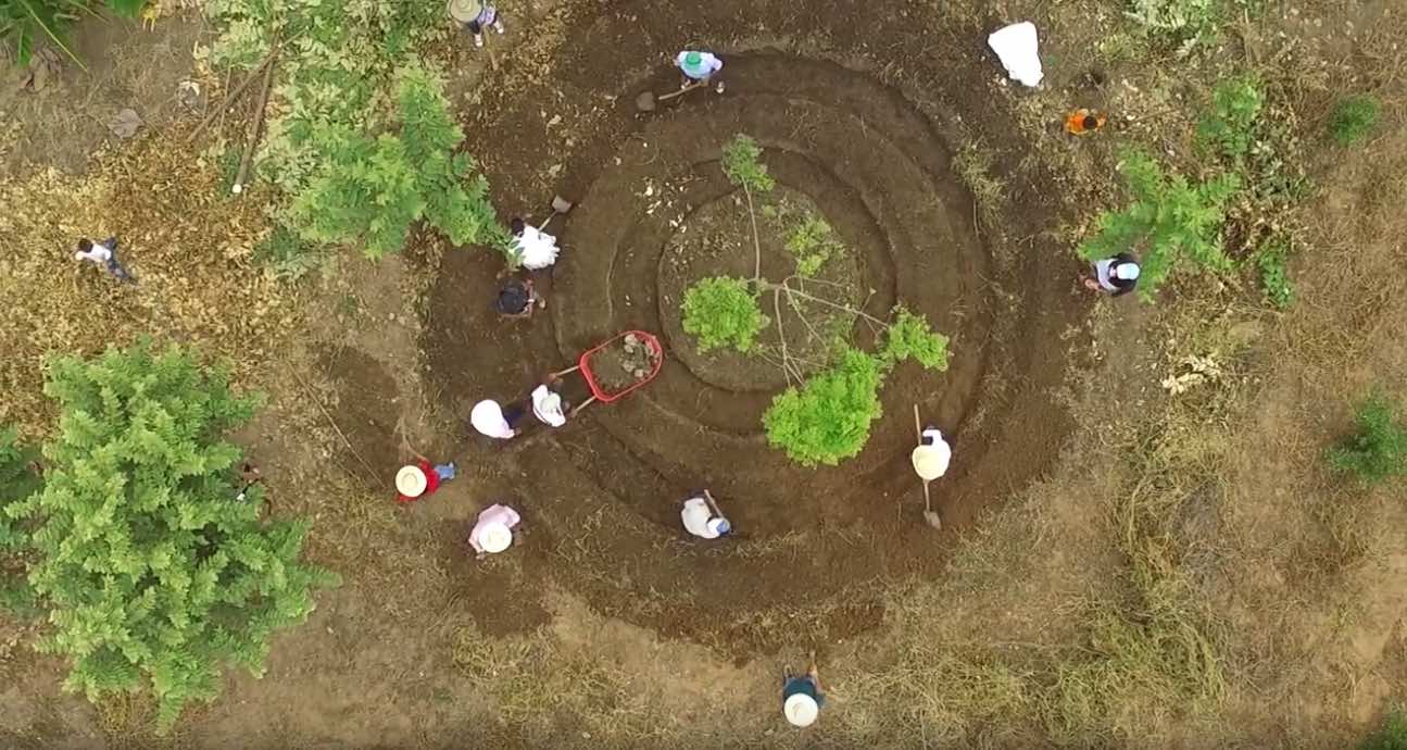 Se hace un canal recto de acceso que atraviesan los anillos que miden 60 centímetros de ancho, marcando las circunferencias para no perder el diseño y se empieza a picar el primer zanjón entre las medidas de 90 centímetros. La tierra se apila sobre los círculos formando terraplenes y camellones. Finalmente se empareja la tierra, se aplica bono orgánico y se riega para proceder a sembrar, aplicar el mando de bosque y ubicar las hojas de cobertura.